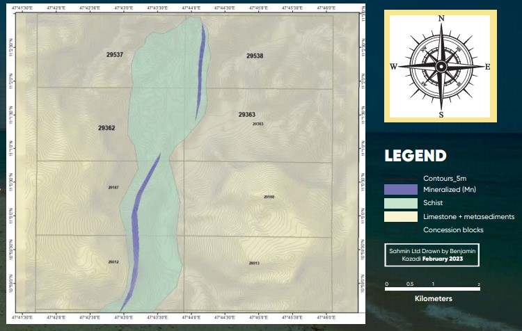 The initial Mn belt has 5000 m length, 88 m width, with NNE strike and sub vertical dip.